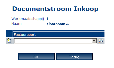 Hier geeft u aan welke factuursoorten er gebruikt kunnen worden voor de inkoopdocumenten die bij deze werkmaatschappij horen. Met behulp van de dropdown zoekt u de factuursoort. Klik op factuursoort wanneer u wilt weten hoe u een deze aanmaakt.