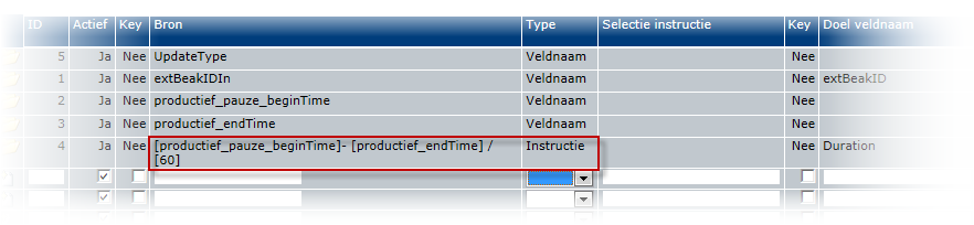 Hier kunnen de bron en doelvelden worden gespecificeerd, waarbij de mogelijkheid bestaat om aan te geven of een bronveld een key vormt, en welk type deze heeft: