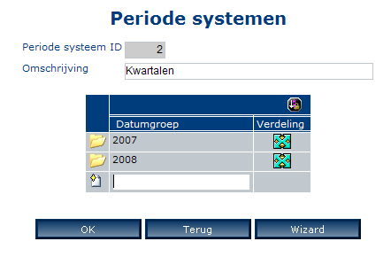 Met de 'Wizard' kunt u op een snelle manier de standaard datumgroepen aanmaken. Uiteraard mag u de verdeling per jaar ook zelf aanmaken. Het voordeel van de wizard is dat deze meerdere jaren tegelijk kan aanmaken of wijzigen.
