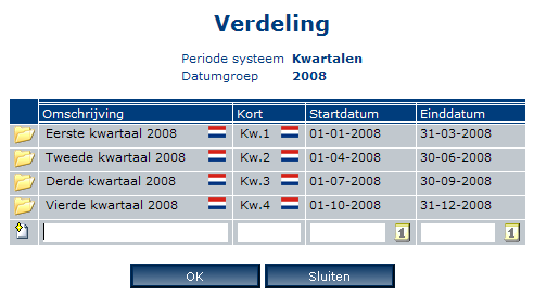 Systeem: Met behulp van de dropdown, kunt u de periode selecteren die u wilt inrichten. Als u op 'OK' klikt, krijgt u een bevestiging dat de periodes zijn aangemaakt. Door vervolgens nog een keer op 'OK' te klikken, gaat u weer terug naar het periode systeem scherm. Dit scherm kan er als volgt uitzien: