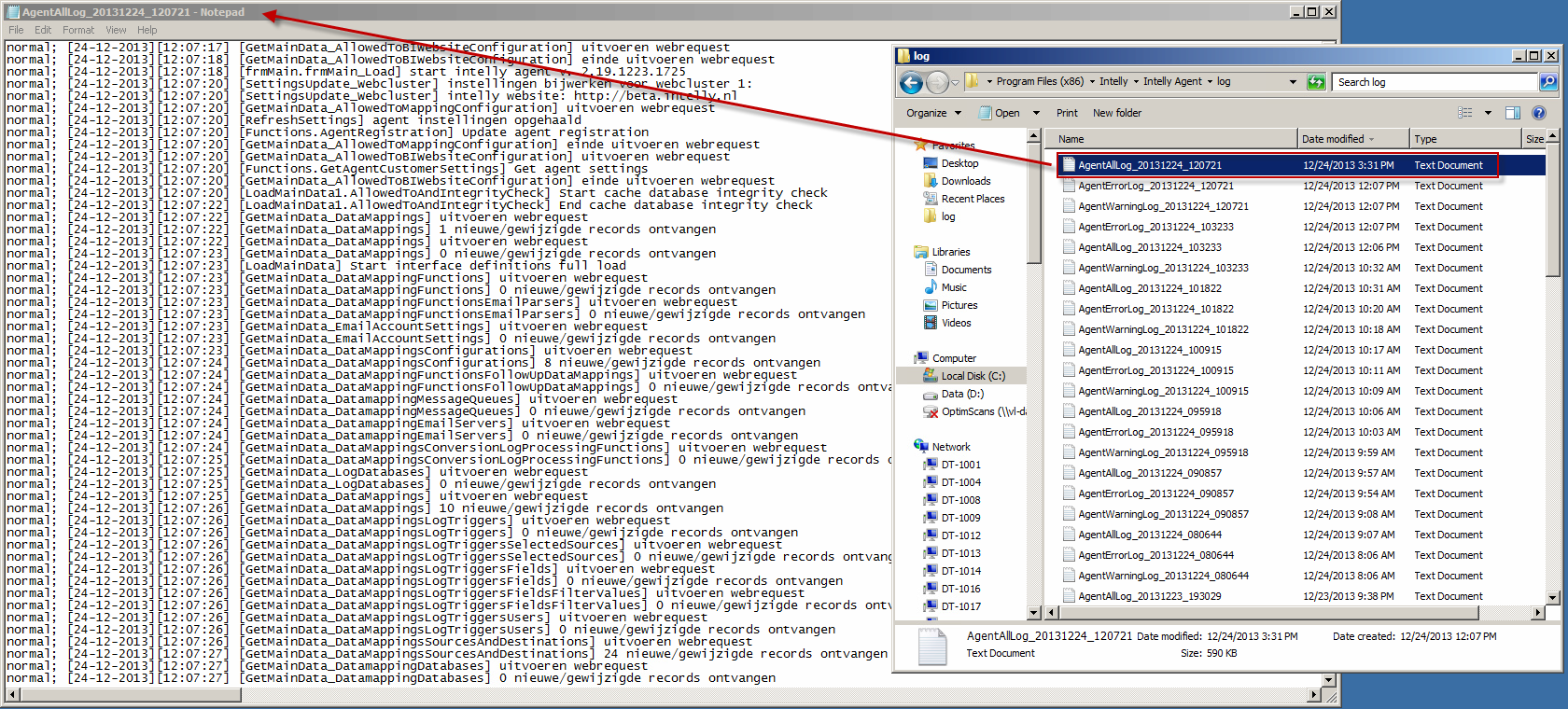 Ga in de verkenner naar: “C:\Program Files (x86)\Intelly\Intelly Agent\log”. Selecteer het meest recente logbestand en open deze in een teksteditor: