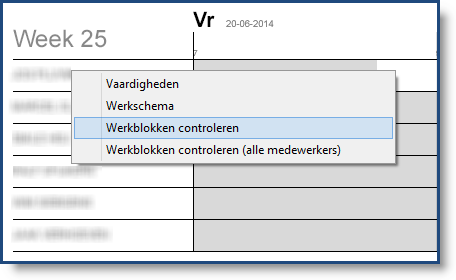 Op het moment dat een feestdag is toegevoegd, en deze dagen moeten worden meegenomen in de werkschemas van monteurs, kan dit, na het aanmaken van een feestdag, worden doorgevoerd vanuit het planbord.Binnen het planbord dient u te klikken op een willekeurige monteur met rechtermuistoets en kiest u de menu optie: "Werkblokken controleren (alle medewerkers)":