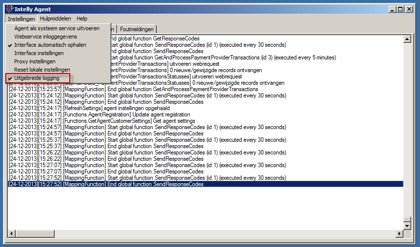 Op de server waar de Intelly Agent draait (192.168.12.57) open je het scherm van de agent waarna je onder het kopje instellingen “Uitgebreide logging” aanklikt.