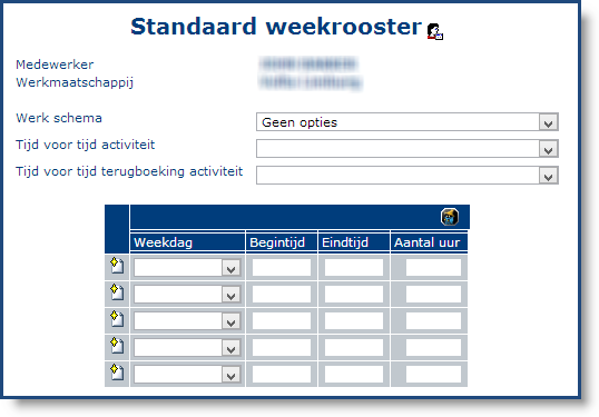 In de tab "Standaard weekrooster" kan roosterinformatie worden toegevoegd over desbetreffende medewerk(st)er: