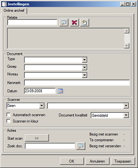 Met het online archief is het eenvoudig om uw papieren digitaal te archiveren en is bedoeld voor de enkelvoudige stukken (niet bulk zoals inkoopfacturen).Het instellen van het online archief wordt nl. per te scannen document gedaan.