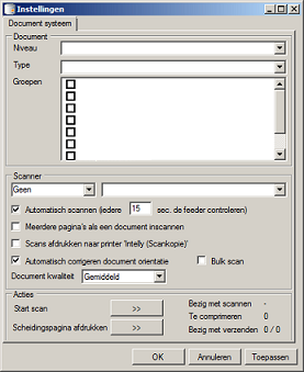 Scanner: Selecteer hier de scanner waarmee u gaat scannen. Intelly heeft zelf al gezocht welke scanners er op uw werkstation zijn geïnstalleerd en of ze middel WIA of middels TWAIN werken.